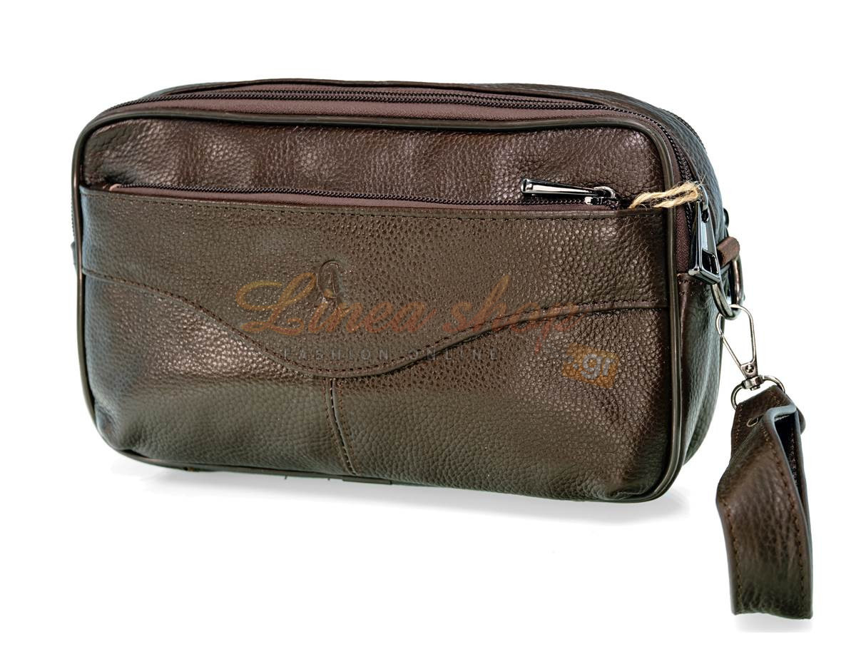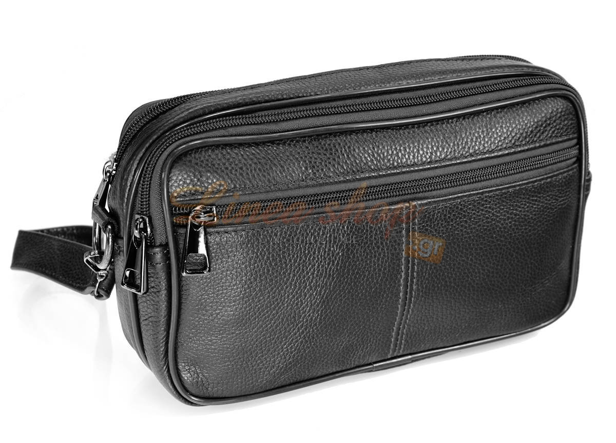 ac Aνδρική δερμάτινη τσάντα χειρός, κατασκευασμένη εξ ολοκλήρου από 100% χοντρό δέρμα μοσχάρι, μέγεθος μεγαλύτερο του μετρίου, με δύο ανεξάρτητους χώρους διαφορετικούς μεγέθους και δύο μεγάλες τσέπες εμπρός και πίσω της τσάντας, όλες οι θέσεις κλείνουν με φερμουάρ, ποιοτική φόδρα στο εσωτερικό, αποσπώμενο φαρδύ χεράκι για τον καρπό.