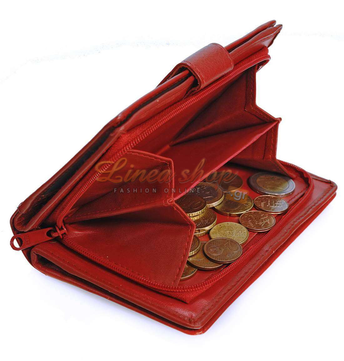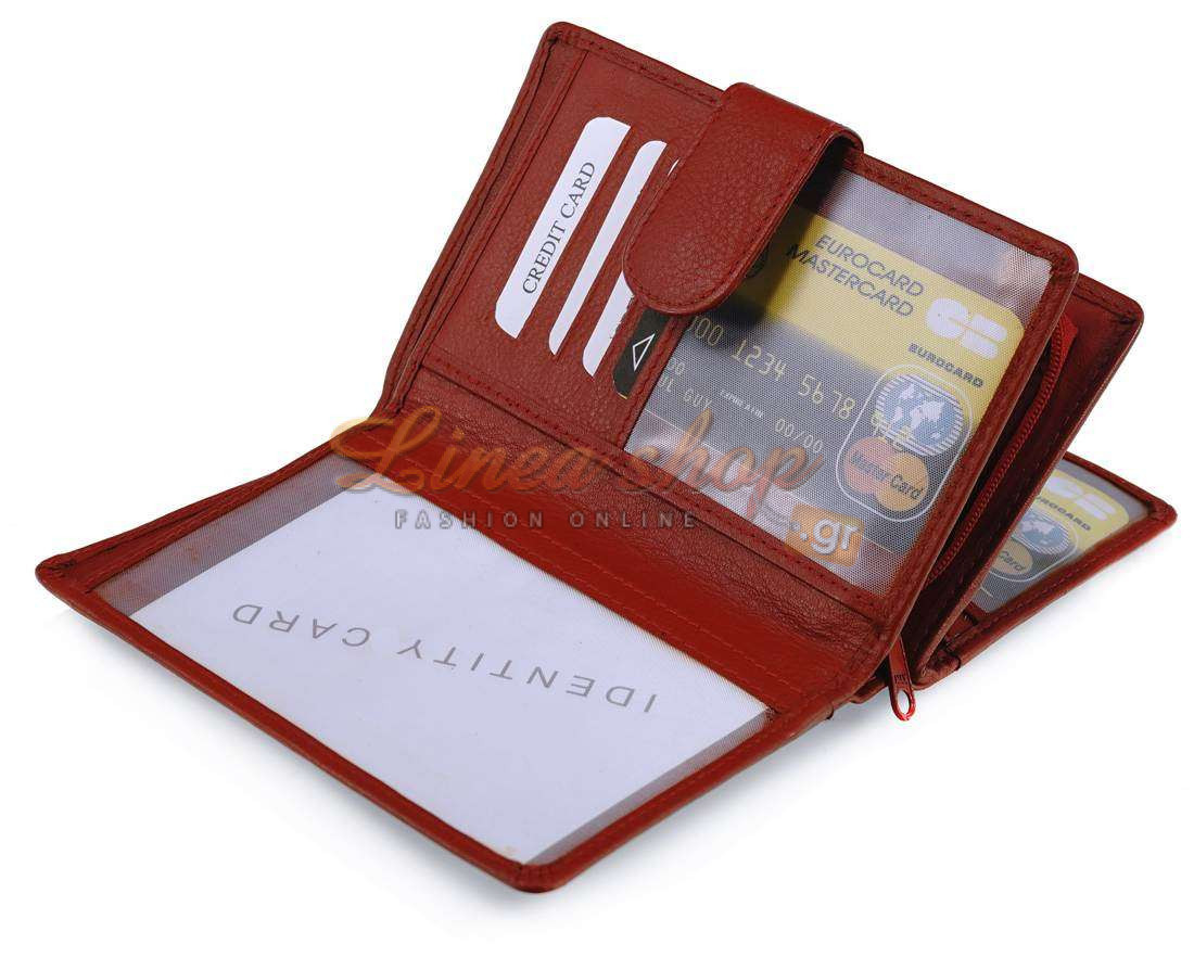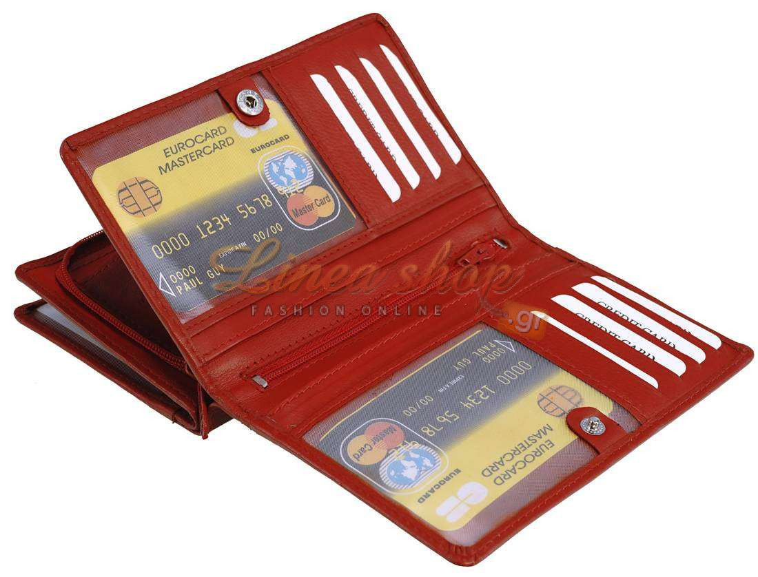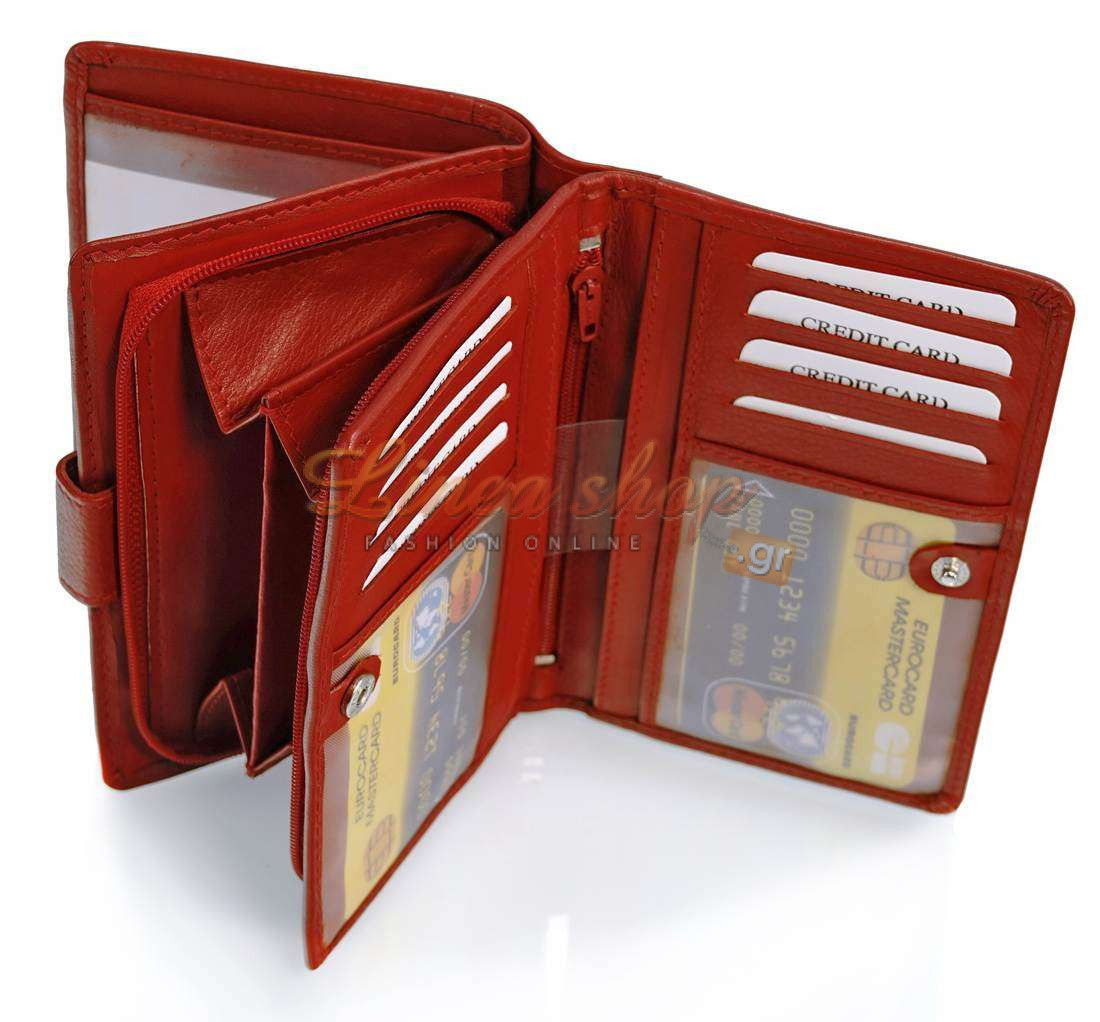 Γυναικείο δερμάτινο πορτοφόλι, από 100% δέρμα μοσχάρι, τρίπτυχο πολυθέσιο με χώρους για 15 κάρτες σε διαφορετικά σημεία, 4 διαφάνειες, διπλό μεγάλο χώρο για τα χαρτονομίσματα, 8 διαφορετικά σημεία για έγγραφα, φερμουάρ με διπλό χώρο και μεγάλο διπλό χώρο για κέρματα στη μέση.