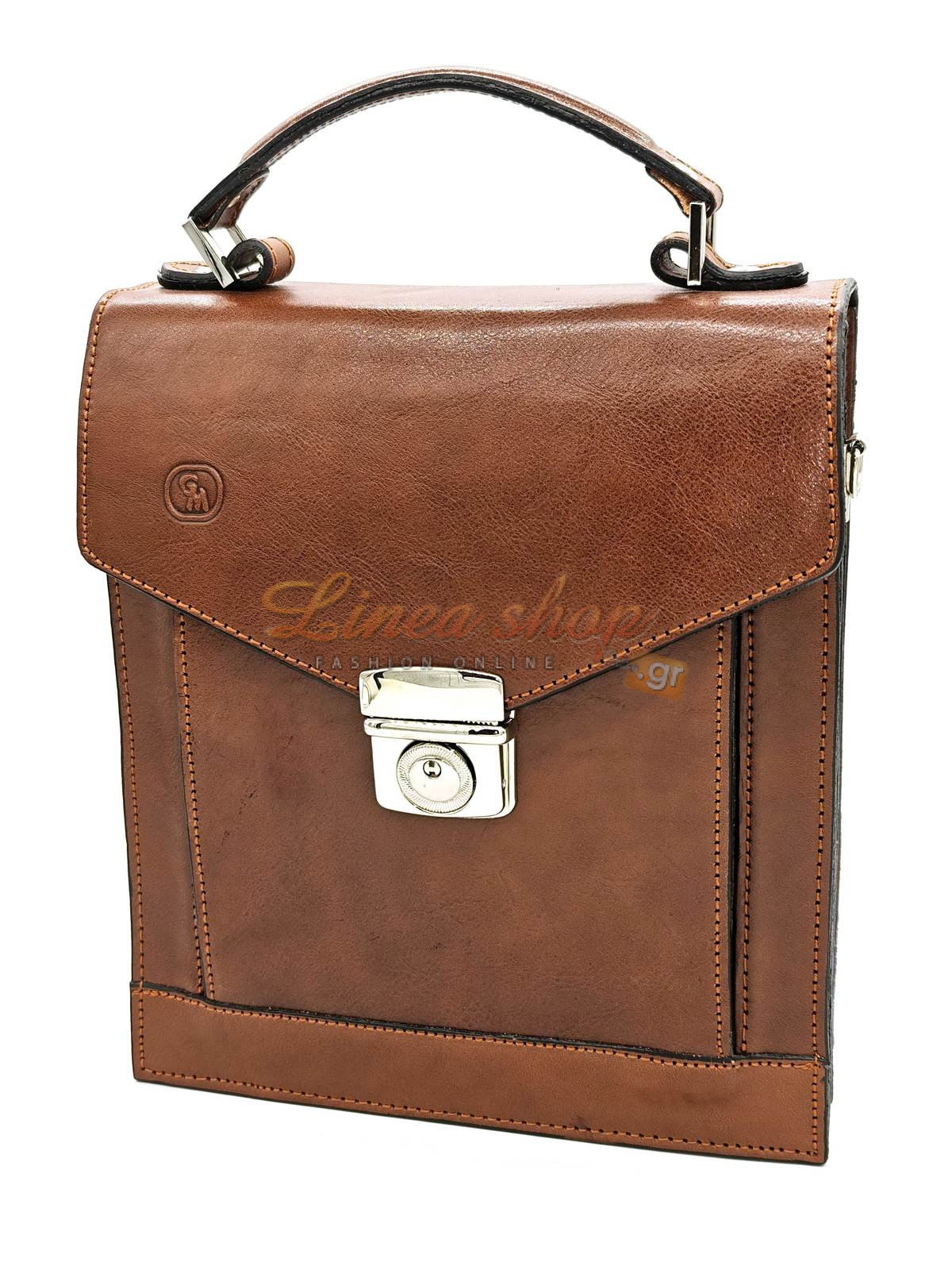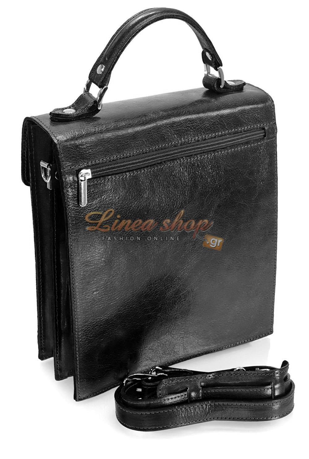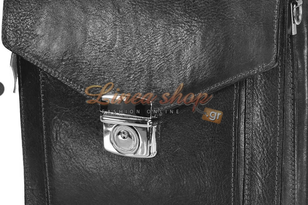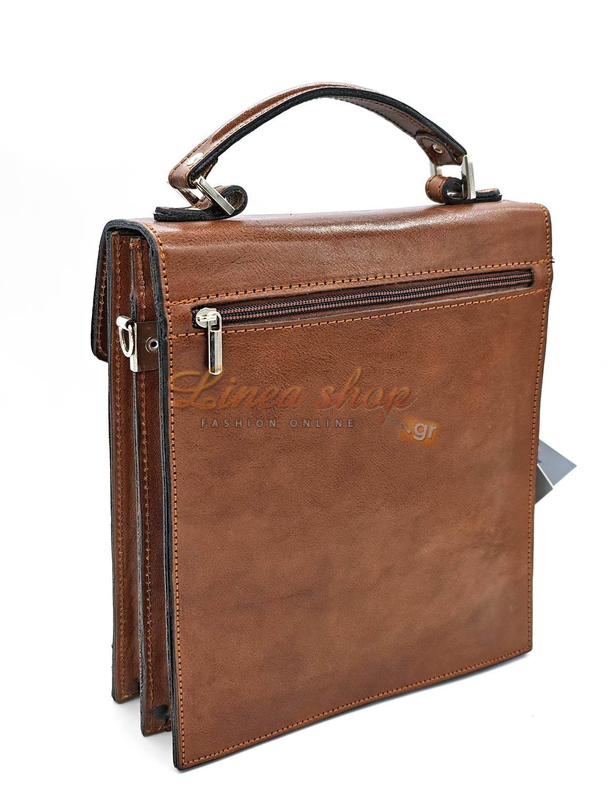 Δερμάτινη αντρική τσάντα, μικρού+ μεγέθους, κατασκευασμένη από πρώτης ποιότητας δέρμα μοσχάρι , αλλά & ποιότητα κατασκευής σε πολύ ανταγωνιστική τιμή, ίδιο δέρμα & εσωτερικά κάτω από το καπάκι κλ, στιβαρά τοιχώματα, η τσάντα διαθέτη 2 ανεξάρτητους χώρους με φερμουάρ στην μέση & μεγάλη τσέπη εμπρός, εξωτερικά τσέπη με φερμουάρ στο πίσω μέρος.