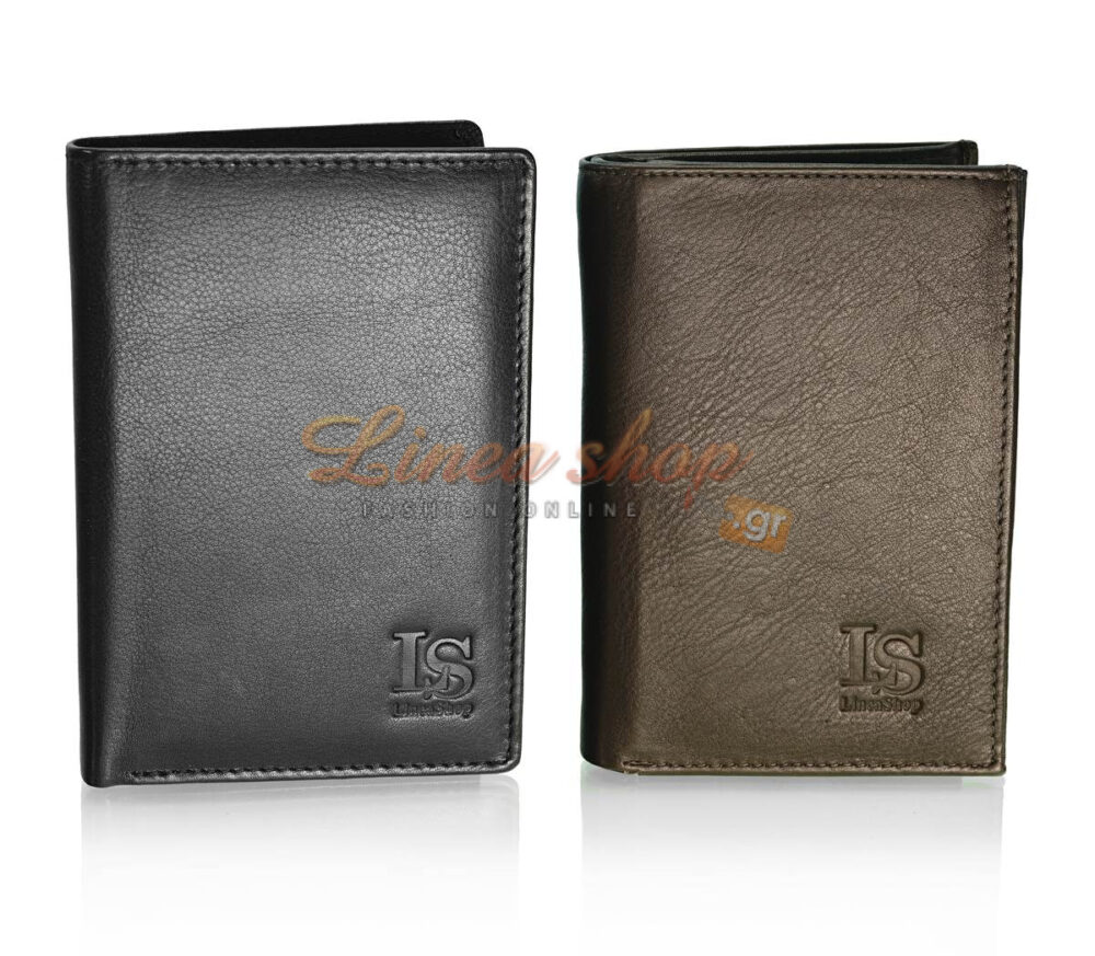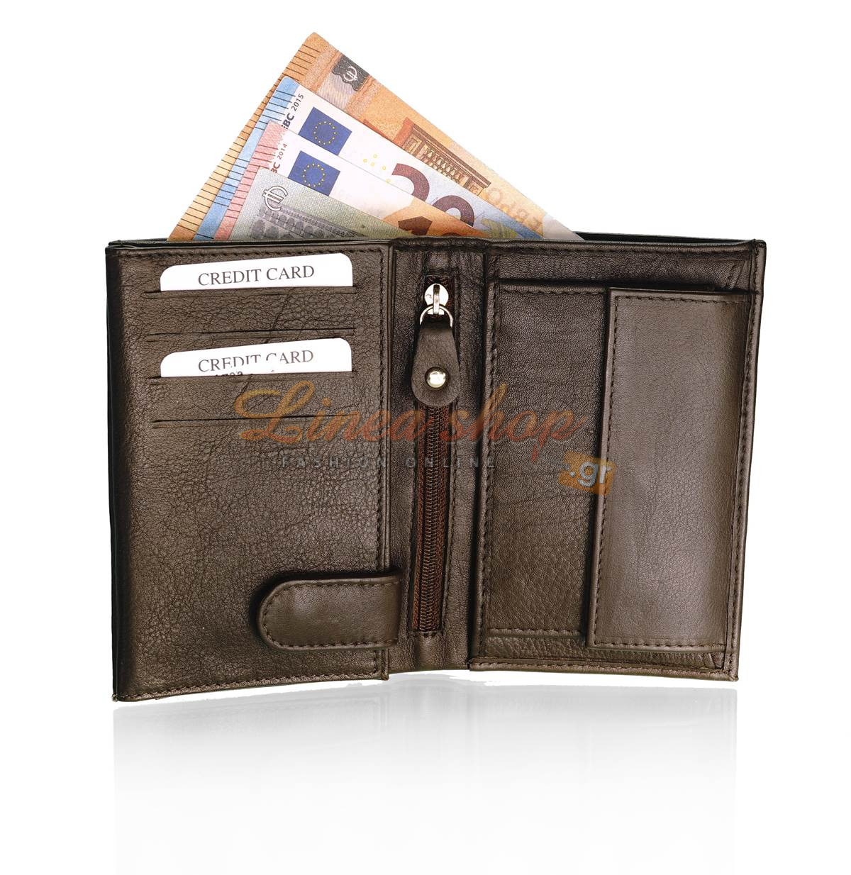 Ανδρικό δερμάτινο πολυθέσιο όρθιας μορφής πορτοφόλι, κατασκευασμένο εξ ολοκλήρου από 100% δέρμα μοσχάρι, με 12 θέσεις για κάρτες, διπλό μεγάλο χώρο για τα χαρτονομίσματα, μεγάλη τσέπη με καπάκι για τα κέρματα, δύο διαφάνειες και τέσσερις χώρους για έγγραφα (οι 2 με φερμουάρ στη μέση), μέγιστο ύψος ταυτότητας 12 cm.