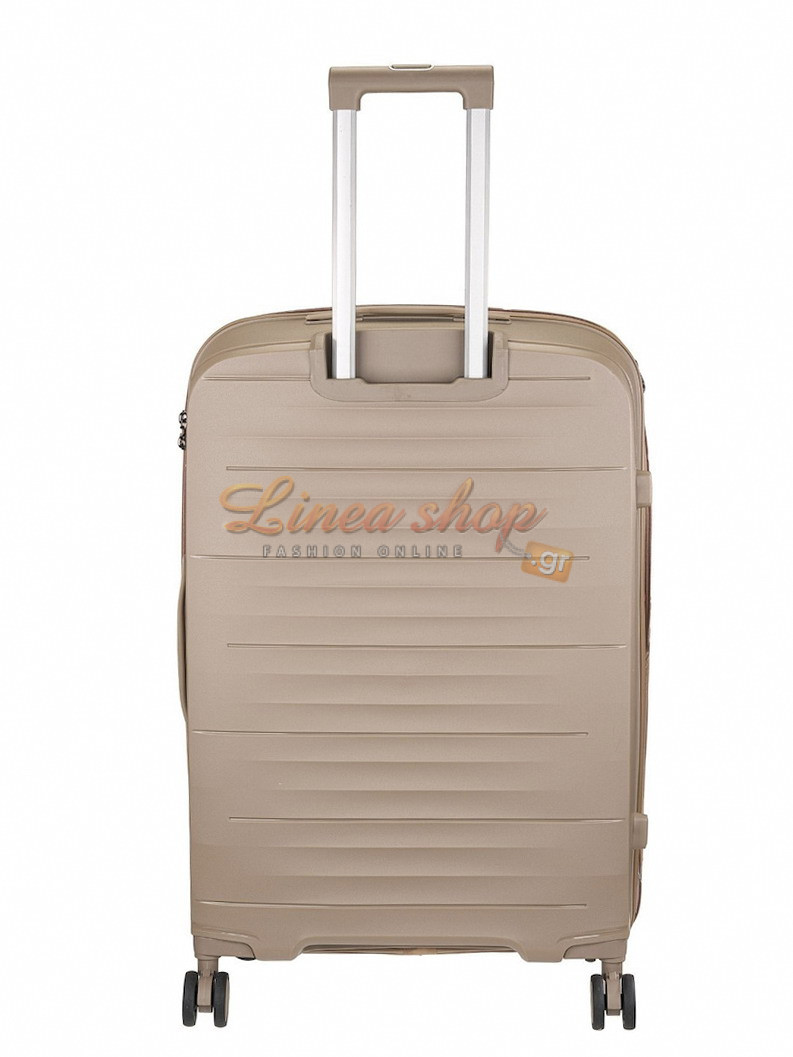 Σκληρή βαλίτσα μεσαίου μεγέθους (Μ), κατασκευασμένη από άθραυστο χυτοπρεσαριστό πολυπροπυλένιο, εγγυημένο υλικό μέγιστης αντοχής που μπορεί να αντέξει ακραία χτυπήματα χωρίς να σπάει.
